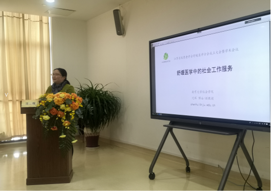 舒缓医学分会线下参会委员合影 学会名誉理事长王虹教授代表学会对分会成立及当选的分会主委、副主委、常务委员、委员们表示热烈祝贺,向为筹建分会辛勤付出的各位专家,致以亲切的问候和衷心的感谢!王虹教授对全省抗衰老医疗健康事业的深邃思考和拳拳忧思,立足我省辐射全国比肩全球的高屋建瓴对分会建设提出了普及生命教育、提升老年健康内涵、保障患者及家属获益、合理配置医疗资源的高质量发展要求与殷切希望! 学会名誉理事长王虹教授对全省抗衰老医疗健康事业提出殷切希望 舒缓医学分会成立大会结束后,由王虹教授、丁清清主任分别主持了学术论坛,论坛邀请了==南京小行医院周明飞院长、南京大学沈晖副教授进行学术交流。 南京小行医院周明飞院长作《社区安宁疗护探索与实践》的主旨报告,结合小行医院安宁疗护病房的开展工作,介绍在南京推广安宁疗护的经验;南京大学沈晖教授作《舒缓医学中的社会工作服务》主旨报告,结合国内外经验, 强调社会工作在舒缓医学推行中的意义和实施策略。 南京小行医院周明飞院长作《社区安宁疗护探索与实践》主旨报告 南京大学沈晖教授作《舒缓医学中的社会工作服务》主旨报告 会议最后,曾彦英主委表示舒缓医学分会将同心协力,积极广泛宣传生命教育及生命态度,提高全民健康素养;提升长三角一体化地区舒缓医疗诊治与服务能力,促进学科发展,加强学术交流;积极规划相关舒缓医学的继续教育课程,提升专业医疗及照护能力;加强和协调协会与各种团体之间的联系和交流,打造共享、共融、共赢平台。 作者:朱 亚 曾彦英 图片:胡 蓉 徐 军 供稿:江苏省抗衰老学会舒缓医学分会