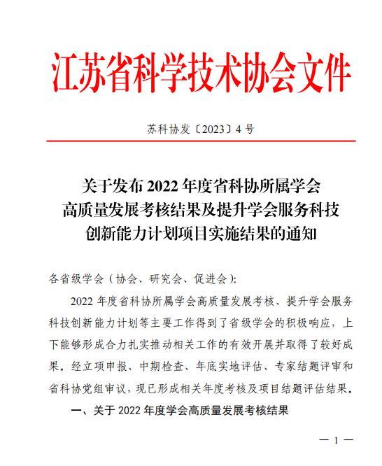 Happy Lantern Festival 点击蓝字 关注我们 近日,省科协发布《2022年度省科协所属学会高质量发展考核结果及提升学会服务科技创新能力计划项目实施结果的通知》和《关于认定“科创江苏”专项行动计划项目结题评估结果》,江苏省抗衰老学会被认定为二类B等学会,学会申报的“一流科普平台”、“会员之家建设”、“品牌学术交流”等6个“提升计划”项目和“省级学会科技服务站”1个“科创江苏”项目同时获得省科协认定。 2022年,江苏省抗衰老学会按照省科协要求持续深化“四服务一加强”建设,深入推进提升学会能力计划与“科创江苏”专项行动融合衔接,搭建高层次、有影响力的品牌学术交流平台,服务“科创江苏”加强与企业对接合作,延缓衰老健康科普宣传实效增强,咨询决策服务和社会化公共服务进一步拓展。下一步,学会将对照2023年省科协所属学会高质量发展要求,认真制定学会年度工作方案及推进计划,大力推动2023年度各项工作有序有效开展,延续抗衰老的特色,力争做出更大的社会影响力,推动学会工作高质量发展再上新台阶。 ❖ 兔 年 大 吉